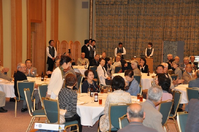 寮歌を斉唱し、最後に司会の音頭でお手を拝借、一本締めを行うも拍手ではなく、万歳をし御苦労様の珍事が起こり楽しく一次会は終了した。