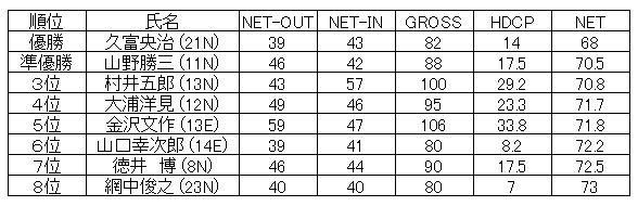 優勝は今回初参加、若手2番手の久富央治さん(21N)、ベスグロは山口幸次郎さん(14E)の