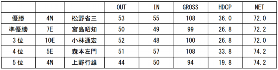 プレー終了後、倶楽部ハウスにて表彰式と懇親会が執り行われました。優勝はN4松野省三さんで、アウト53、イン55、グロス108、ハンディキャップ36、