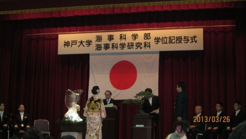 神戸大学全体の式は、神戸のワールド記念ホールで挙行された後、海事科学部の学生は