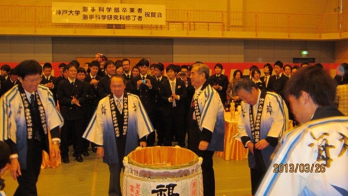 神戸大学理事挨拶に続き、海神会会長 西原興一郎様に祝辞、恒例の「薦被り」の鏡開きを