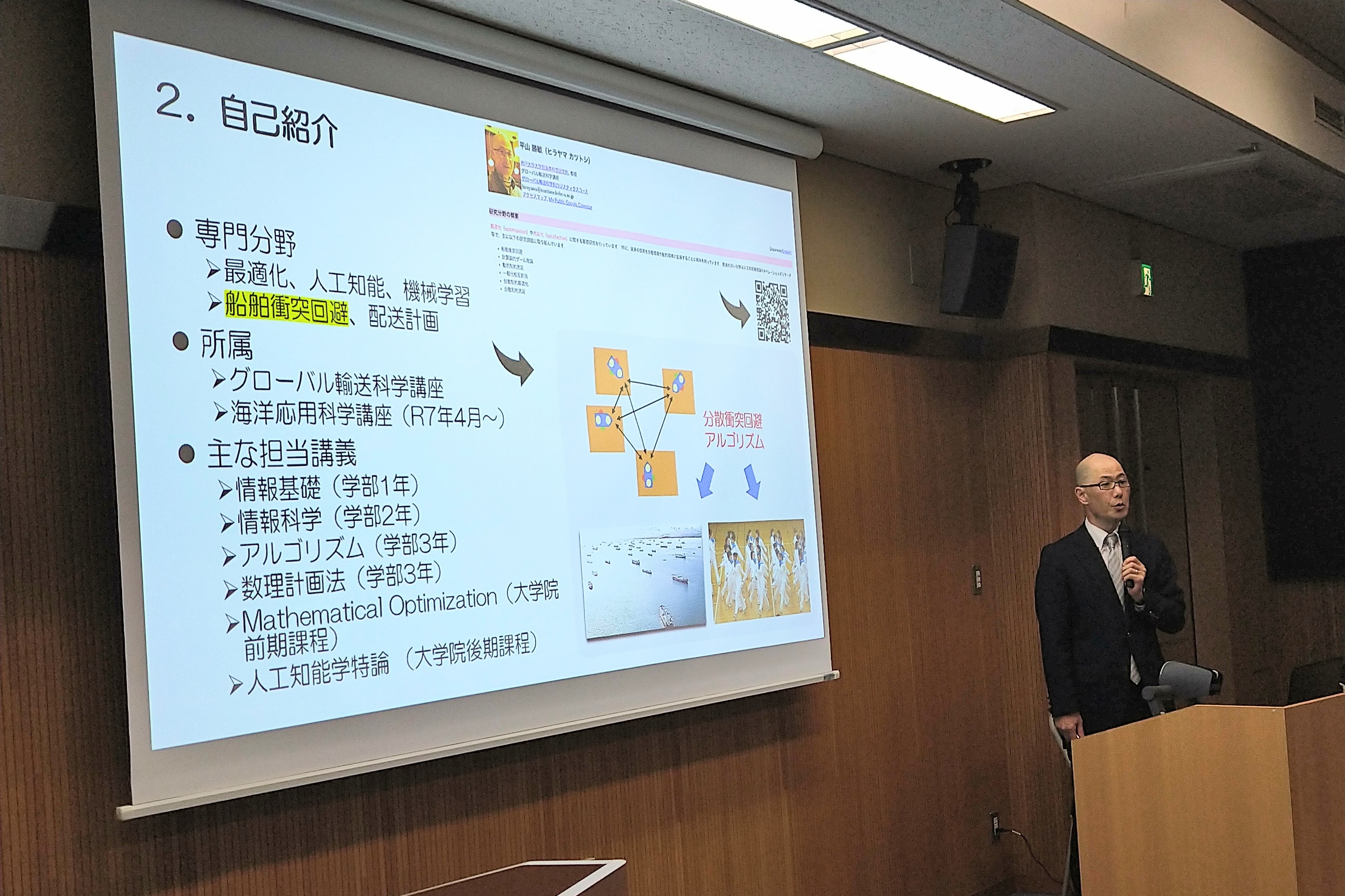 平山学部長のあいさつに続き、「海洋から海外へ」チリ領事館勤務の八木翼氏(卒2011年)がチリからオンラインで、「海へのロマン」~洋上風力発電事業を実現し、今思うこと~幸村展人氏の記念講演があり、商船魂の受け継がれてました。