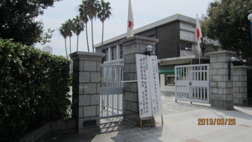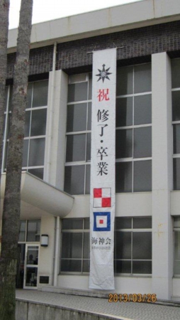 最後に成りましたが講堂の入口に国際信号の旗りゅう信号「UW」旗をあしらった垂れ幕で、