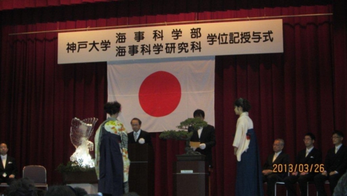 神戸大学全体の式は、神戸のワールド記念ホールで挙行された後、海事科学部の学生は
