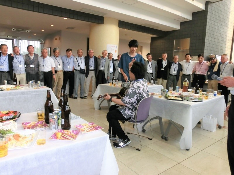 海事フォークソング部の内山亮介学生等の伴奏で、白波寄する~を共に肩を組み輪となって斉唱しました。