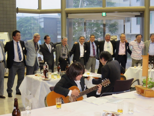 寮歌を参加者全員で肩を組み、斉唱・熱唱した。