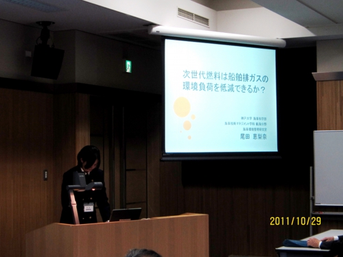 小田研究科長の大学の現状報告に続いて、尾田恵梨奈学生の研究発表があり